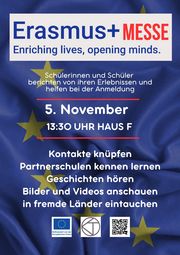 Die Erasmus+ Messe findet wie jedes Jahr in Haus F statt. Ab 13:30 Uhr habt ihr die Möglichkeit unser Austauschprogramm Erasmus+ kennenzulernen und Informationen von ehemaligen Teilnehmenden zu…