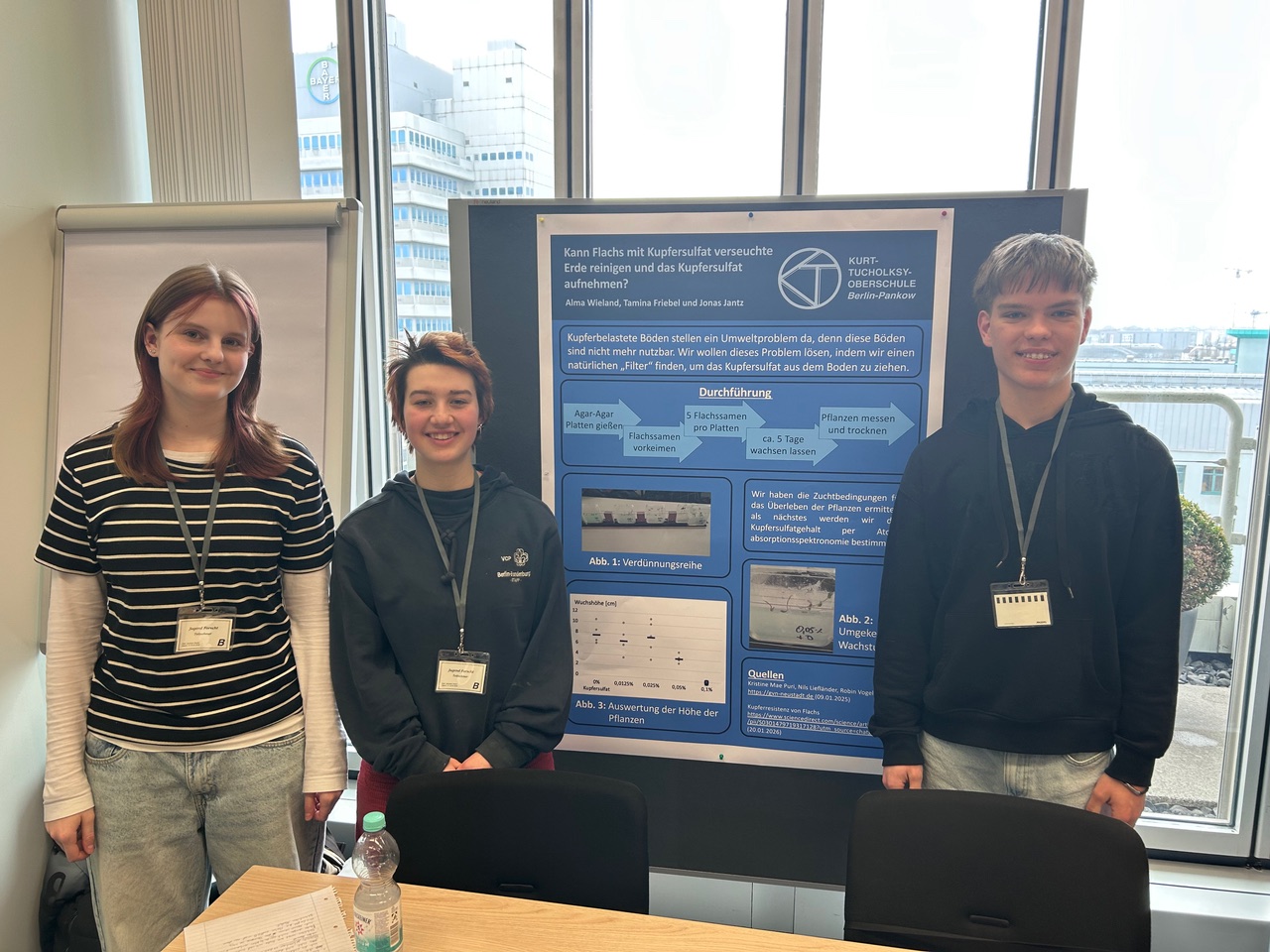 Auch Schwermetall-Kontamination in Böden, eine Folge des Bergbaus, sind weltweit ein Problem für die Natur und die Landwirtschaft. Tamina (10b), Jonas (10c) und Alma (10f) wollten hier an einer Lösung finden und haben in ihrem Projekt daran gearbeitet, Kupfer-Ionen mithilfe von Pflanzen aus dem Boden zu holen. Dafür wurden sie von der Jury mit einem 2. Preis ausgezeichnet.