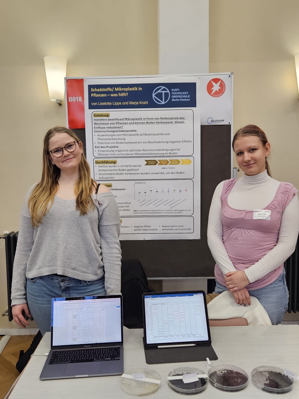 Marja und Lieselotte (beide 10f) arbeiten schon seit fast zwei Jahren daran, wie man die negativen Folgen von Mikroplastik in Ackerböden durch Zusätze kompensieren kann. Dazu haben die beiden eng mit einer Wissenschaftlerin an der Freien Universität (Herzlichen Dank an Frau Dr. Maaß!) zusammengearbeitet und wurden von der Jury mit einem Sonderpreis ausgezeichnet.