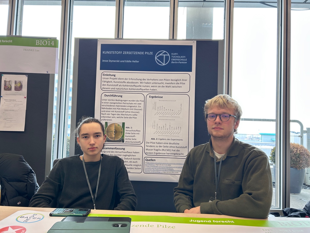 Mikroplastik-abbauende Pilze machten jüngst Schlagzeile, aber kann man das noch verbessern und technisch nutzbar machen? Diese Frage stellten sich Jesse (13.2) und Eddie (13.5). Dazu wurden verschiedene Mikroorganismen eine Woche lang an der Freien Universität auf ihre plastik-abbauenden Eigenschaften untersucht. Hierfür vergab die Jury einen 3. Preis.