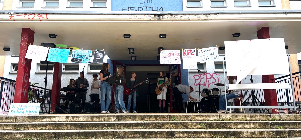 Im zweiten Block führten Schüler:innen der Theater- und DS-Kurse eine kurze Intervention durch, um auf die Veranstaltung im Hof B hinzuweisen und Elternbriefe zu verteilen. Ab 13:00 Uhr begann die eigentliche Protestveranstaltung mit einer Plakataktion, Stickerverleihung und Bandauftritten. Die AG Kultur bedankt sich bei allen Beteiligten für die Unterstützung und das Engagement.